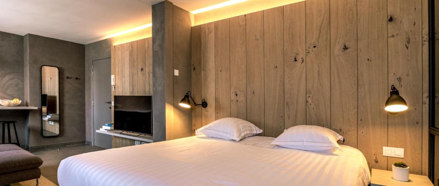 One-Bedroom Apartment. Modern one bedroom apartment with a curved flat screen TV and a fully equipped kitchen. The bathroom has a shower. ;