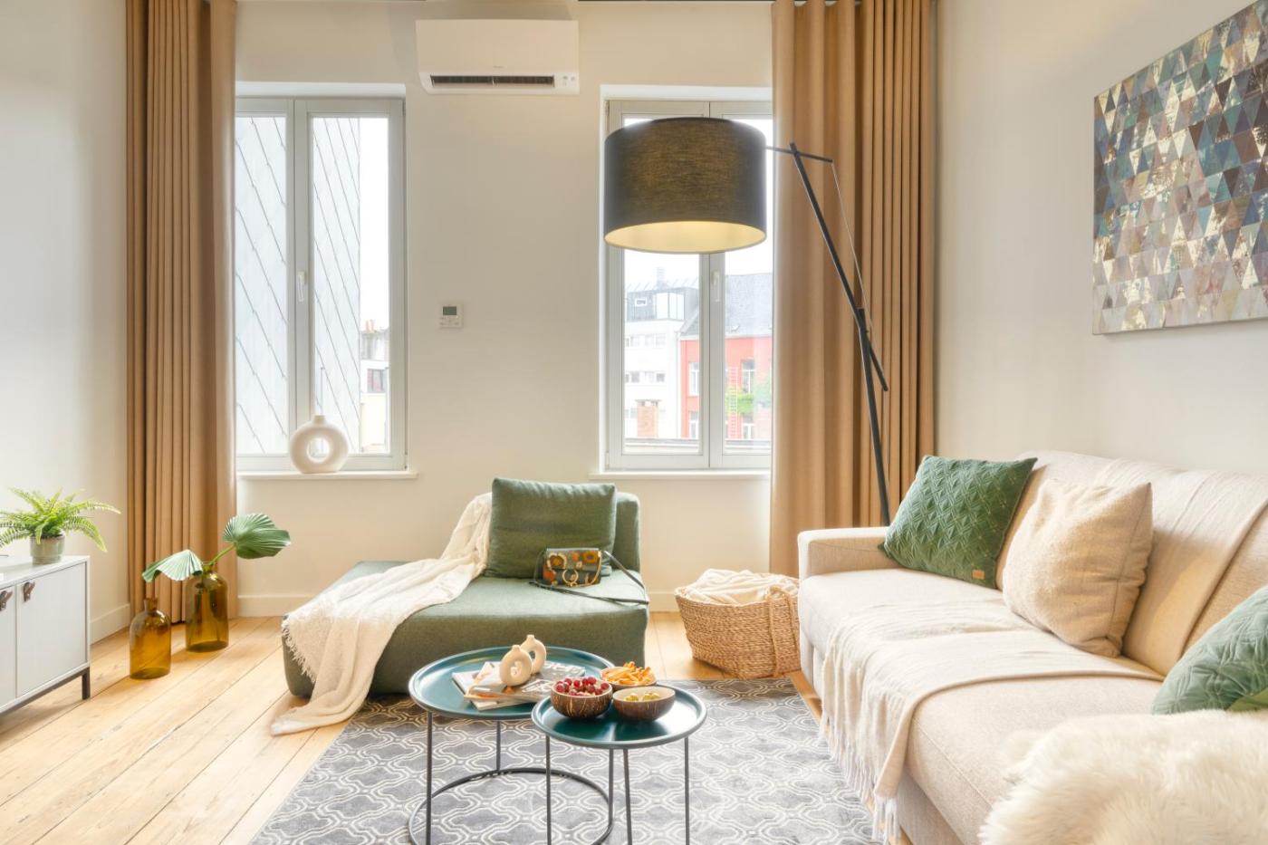 One-Bedroom Apartment. Guests can make meals in the kitchen that is equipped with a stovetop, a refrigerator, a dishwasher and a microwave. This apartment is air-conditioned and features a seating area with a flat-screen TV, a tea and coffee maker, a dining area, parquet floors, as well as heating. The unit offers 1 bed.